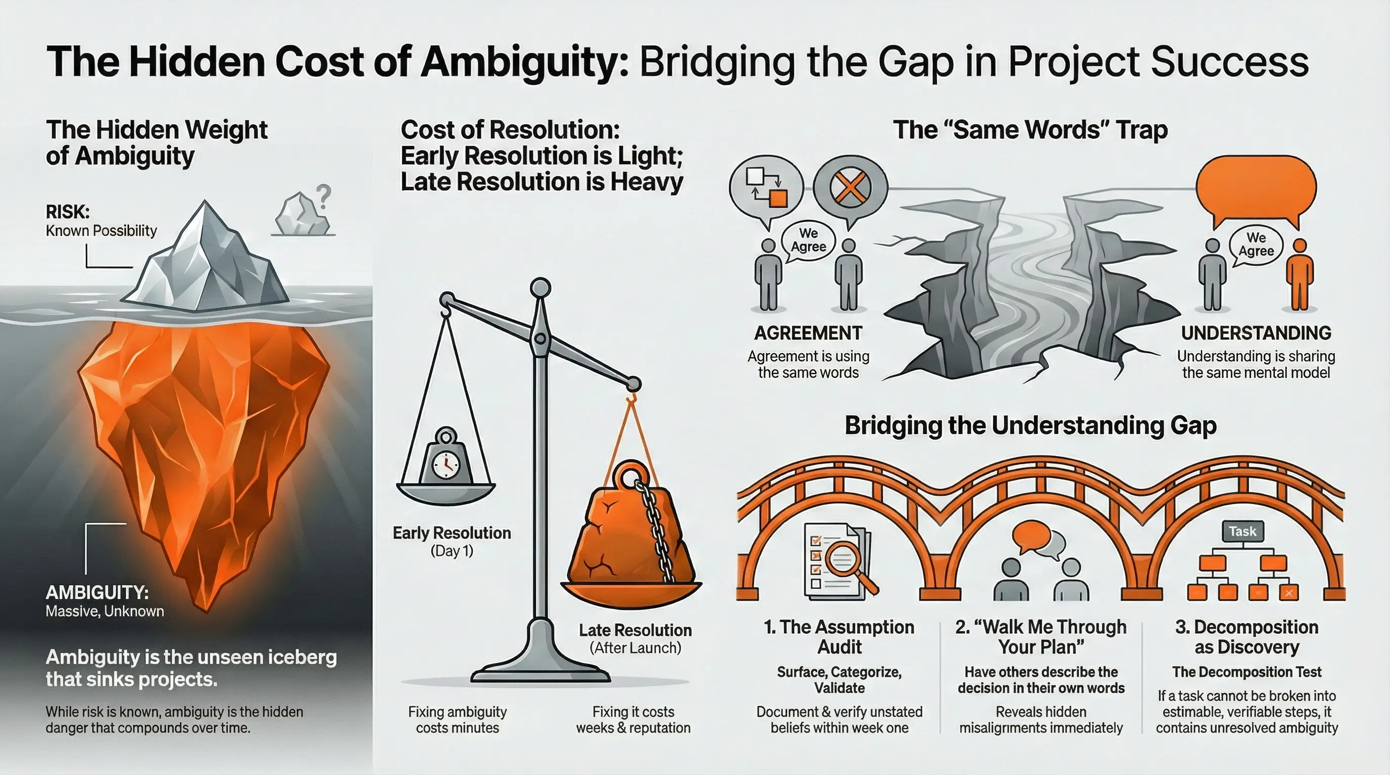 Ambiguity is not the same as risk. Risk is something you know might go wrong. Ambiguity is something you do not yet know you need to clarify. It hides in the spaces between words, in the deliverables everyone assumes are straightforward, in the questions no one thought to ask because the answer seemed obvious.
