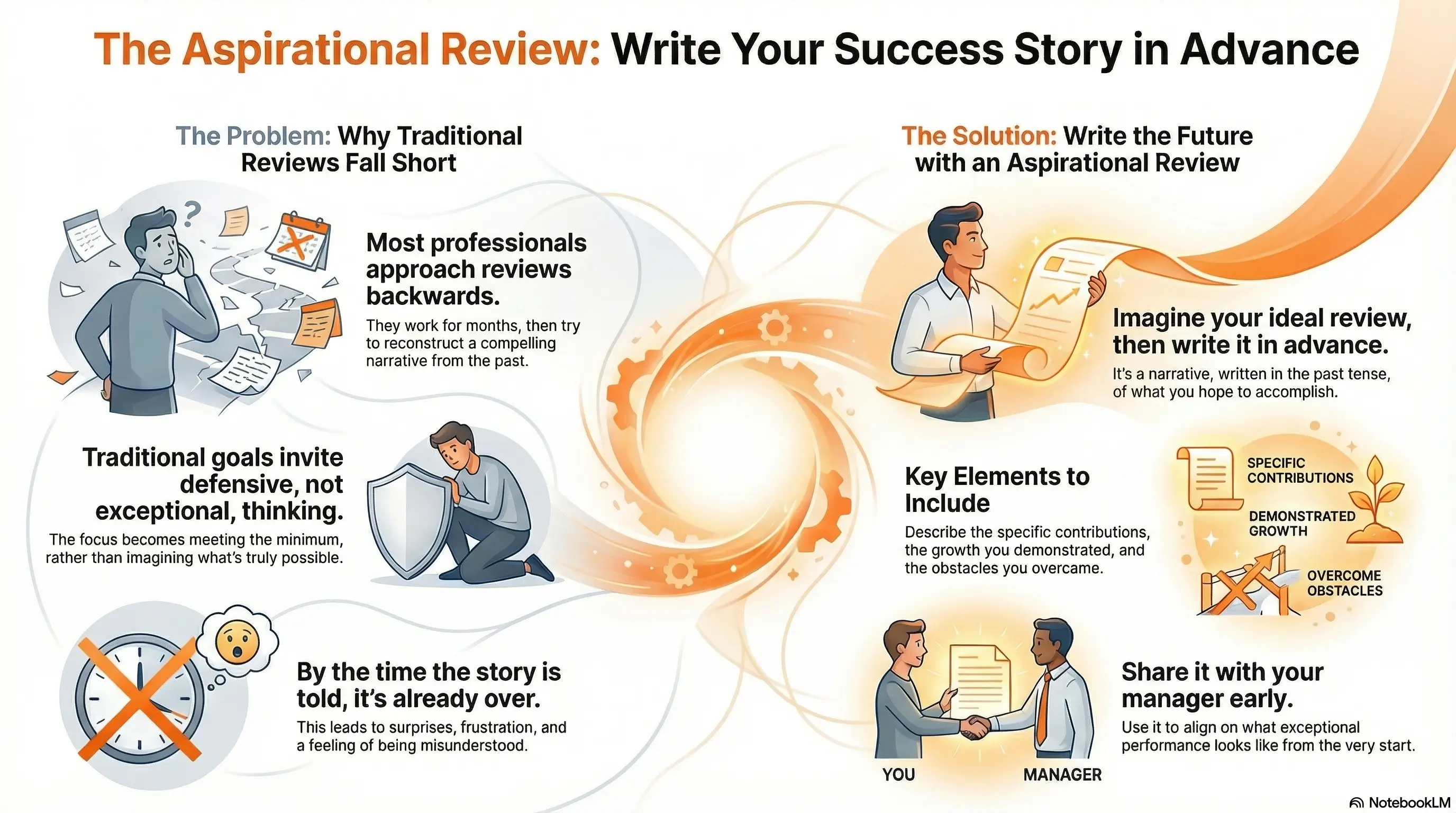 This is not goal-setting. Goals are targets. The Aspirational Review is a story. It imagines a future state in vivid detail: the problems you solved, the impact you created, the growth you demonstrated, the obstacles you overcame. It is the review your manager would write if everything went as well as it plausibly could.